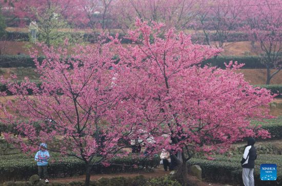 Tourists view cherry blossoms in a tea garden in Xiang'an District of Xiamen, southeast China's Fujian Province, on Feb. 4, 2023. (Photo by Zeng Demeng/Xinhua)