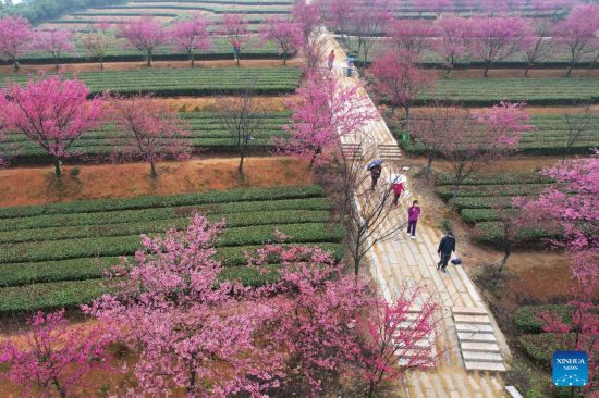 This aerial photo taken on Feb. 4, 2023 shows tourists viewing cherry blossoms in a tea garden in Xiang'an District of Xiamen, southeast China's Fujian Province. (Photo by Zeng Demeng/Xinhua)