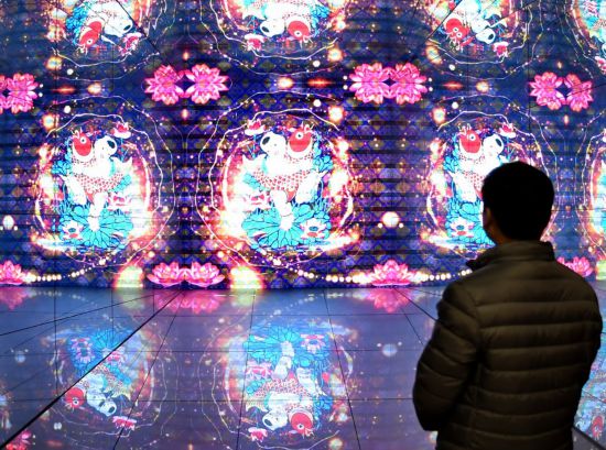 A tourist visits the Wuqiang woodblock New Year painting museum in Wuqiang County, north China's Hebei Province, Feb. 3, 2023. (Xinhua/Mu Yu)