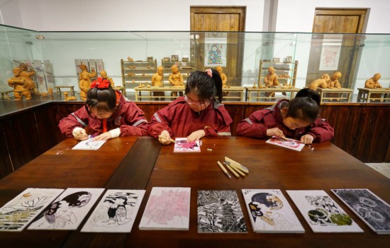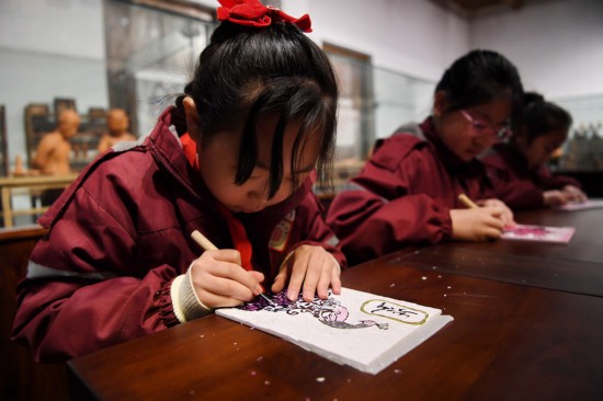 Children learn making woodblock New Year paintings at the Wuqiang woodblock New Year painting museum in Wuqiang County, north China's Hebei Province, Feb. 3, 2023. (Xinhua/Mu Yu)