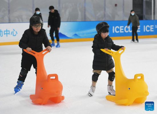 Children enjoy skating at National Aquatics Centre (the "Ice Cube") in Beijing, capital of China, Feb. 4, 2023. Activities were held here on Saturday to mark the one-year anniversary of Beijing 2022 Winter Olympics. (Xinhua/Ren Chao)