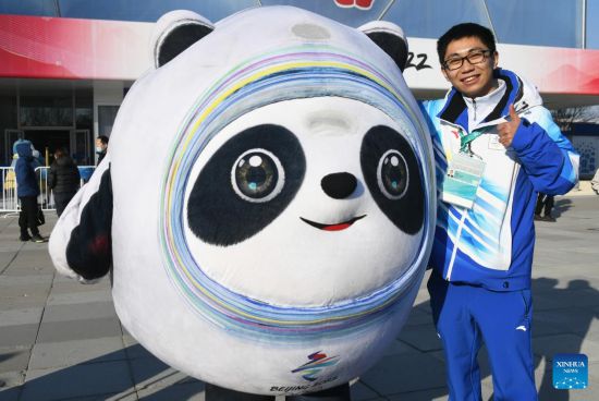 Bi Tingzhu, venue operation team member of Beijing 2022 Winter Olympics, takes a photo with Bing Dwen Dwen outside the National Aquatics Centre (the "Ice Cube") in Beijing, capital of China, Feb. 4, 2023. Activities were held here on Saturday to mark the one-year anniversary of Beijing 2022 Winter Olympics. (Xinhua/Ren Chao)