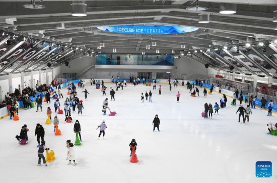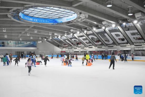 People enjoy skating at National Aquatics Centre (the "Ice Cube") in Beijing, capital of China, Feb. 4, 2023. Activities were held here on Saturday to mark the one-year anniversary of Beijing 2022 Winter Olympics. (Xinhua/Ren Chao)