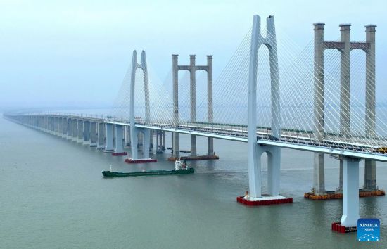 This photo taken on Feb. 4, 2023 shows the Quanzhou Bay cross-sea bridge, a part of the Fuzhou-Xiamen high-speed railway, in southeast China's Fujian Province.