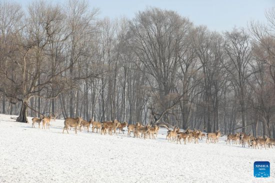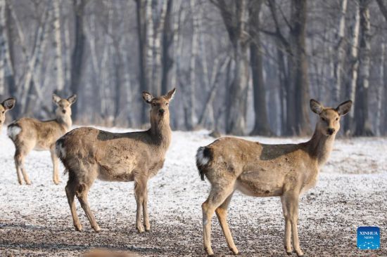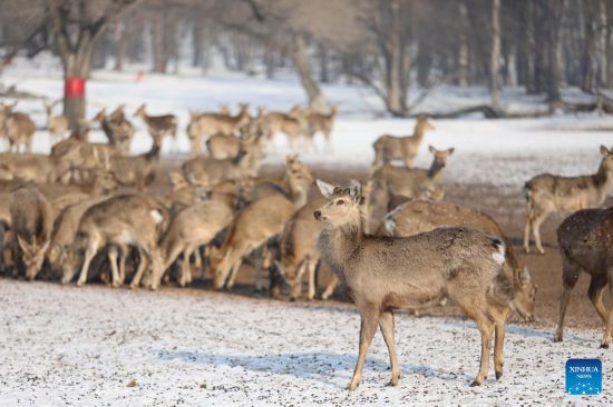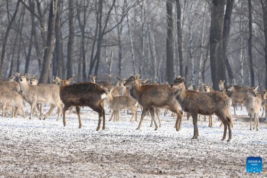 Sika deer are seen in Pingshan Royal Deer Park in Harbin, northeast China's Heilongjiang Province, Feb. 4, 2023. Pingshan Royal Deer Park, located in Pingshan Township of Harbin, covers an area of 462 hectares. Currently, there are more than 1,000 sika deer and red deer in this park. (Xinhua/Zhang Tao)