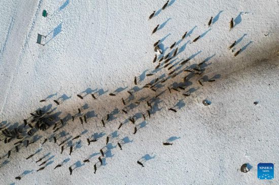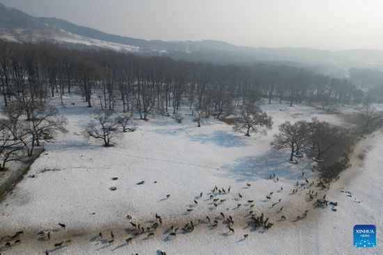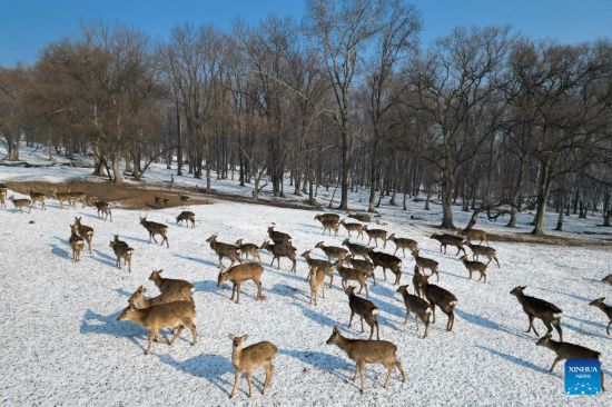 This aerial photo taken on Feb. 4, 2023 shows sika deer foraging in Pingshan Royal Deer Park in Harbin, northeast China's Heilongjiang Province. Pingshan Royal Deer Park, located in Pingshan Township of Harbin, covers an area of 462 hectares. Currently, there are more than 1,000 sika deer and red deer in this park. (Xinhua/Zhang Tao)