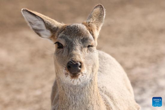 This photo taken on Feb. 4, 2023 shows a sika deer in Pingshan Royal Deer Park in Harbin, northeast China's Heilongjiang Province. Pingshan Royal Deer Park, located in Pingshan Township of Harbin, covers an area of 462 hectares. Currently, there are more than 1,000 sika deer and red deer in this park. (Xinhua/Zhang Tao)