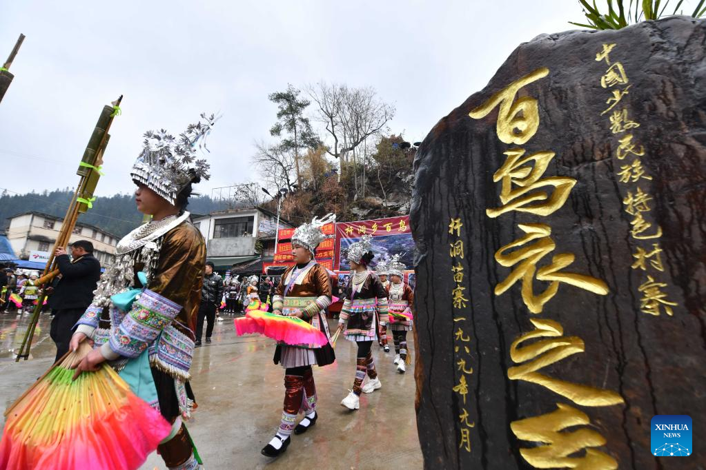 People of Miao ethnic group take part in the "Bainiaoyi" Lusheng festival in Dangjiu Village, Gandong Township, Rongshui Miao Autonomous County, south China's Guangxi Zhuang Autonomous Region, Feb. 2, 2023. "Bainiaoyi" Lusheng festival is a traditional festival in Gandong Township, which is held on the 12th day of the first month on Chinese lunar calendar, during which people wear "bainiaoyi," a traditional clothing of ethnic group, blow Lusheng, a traditional reed-pipe wind instrument, and perform traditional dancing. (Xinhua/Huang Xiaobang)