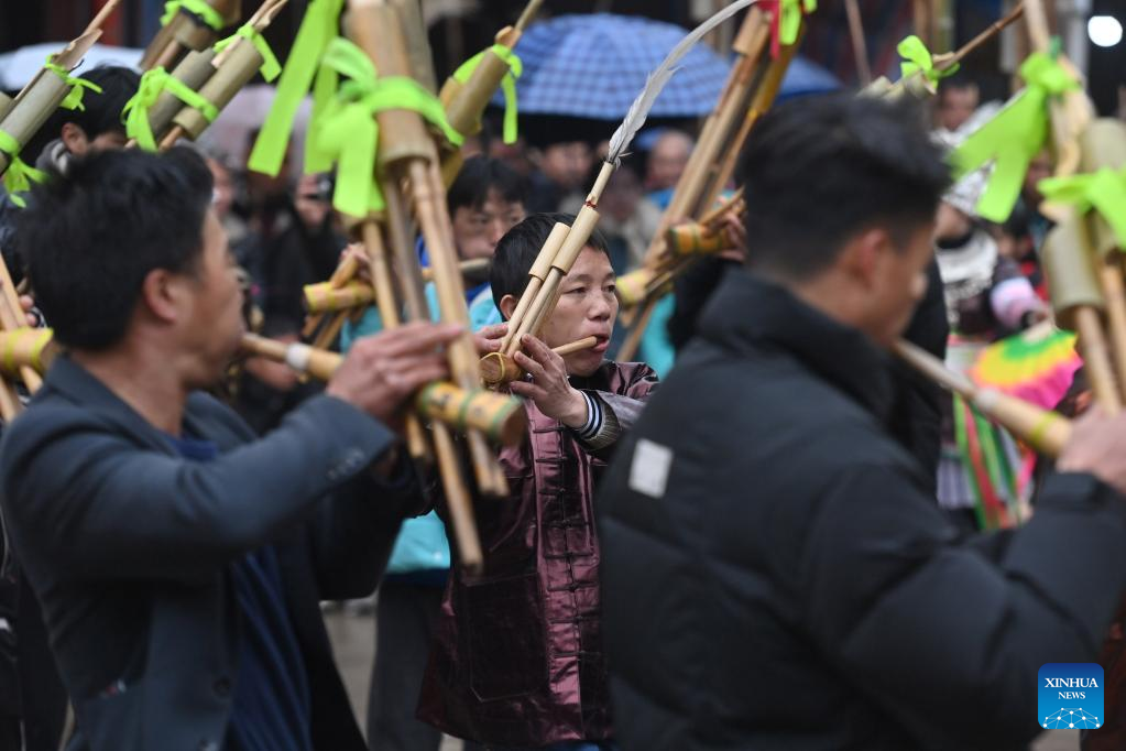 People of various ethnic groups blow Lusheng, a traditional reed-pipe wind instrument, during the "Bainiaoyi" Lusheng festival in Gandong Township, Rongshui Miao Autonomous County, south China's Guangxi Zhuang Autonomous Region, Feb. 2, 2023. "Bainiaoyi" Lusheng festival is a traditional festival in Gandong Township, which is held on the 12th day of the first month on Chinese lunar calendar, during which people wear "bainiaoyi," a traditional clothing of ethnic group, blow Lusheng and perform traditional dancing. (Xinhua/Huang Xiaobang)