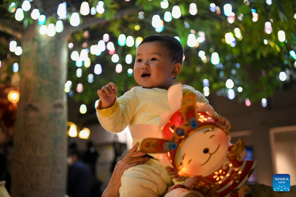 A kid is pictured at a Lantern Festival fair held in Nantou ancient town in Shenzhen, south China's Guangdong Province, on Feb. 4, 2023. A fair was held in Nantou ancient town to celebrate the upcoming Lantern Festival, which falls on Feb. 5 this year. (Xinhua/Liang Xu)