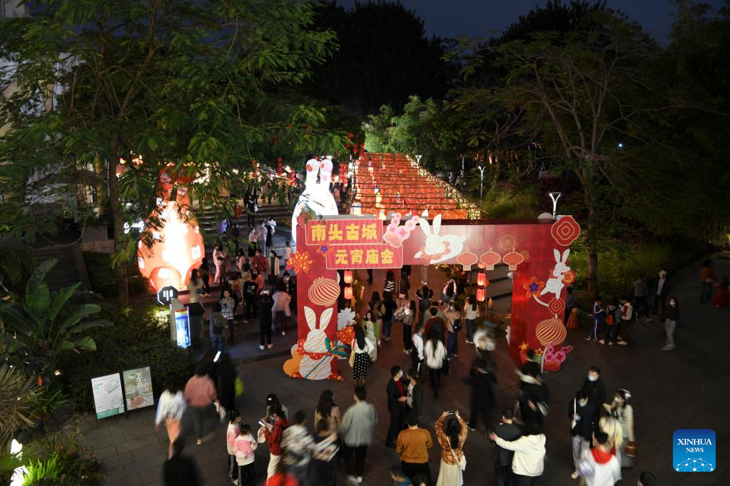 Tourists visit a Lantern Festival fair held in Nantou ancient town in Shenzhen, south China's Guangdong Province, on Feb. 4, 2023. A fair was held in Nantou ancient town to celebrate the upcoming Lantern Festival, which falls on Feb. 5 this year. (Xinhua/Liang Xu)