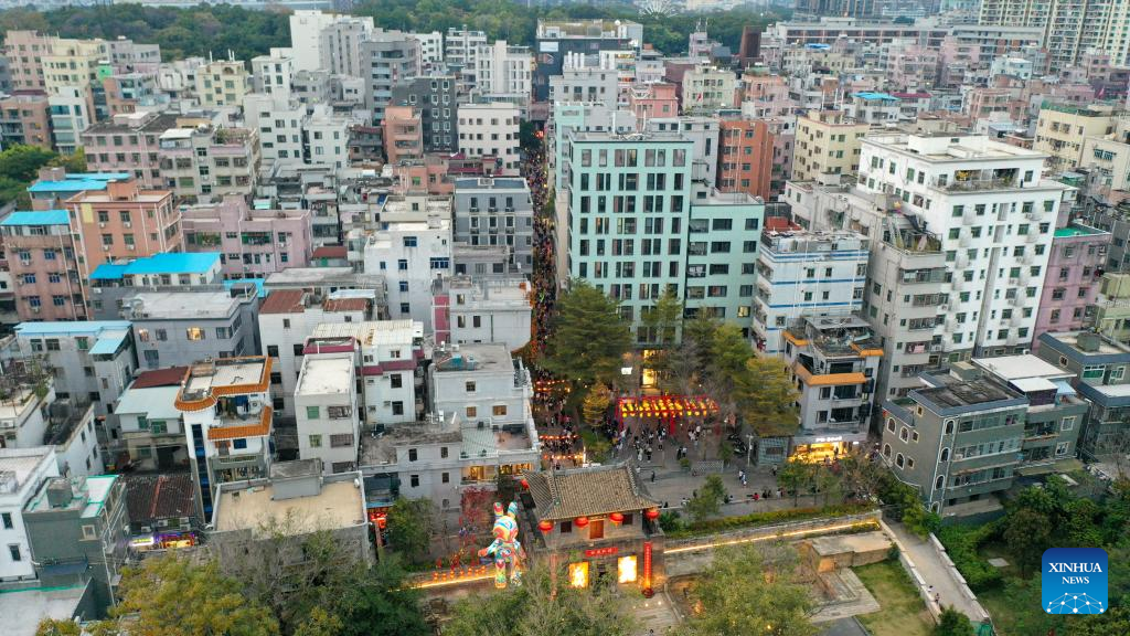 This aerial photo taken on Feb. 4, 2023 shows Nantou ancient town in Shenzhen, south China's Guangdong Province. A fair was held in Nantou ancient town to celebrate the upcoming Lantern Festival, which falls on Feb. 5 this year. (Xinhua/Liang Xu)