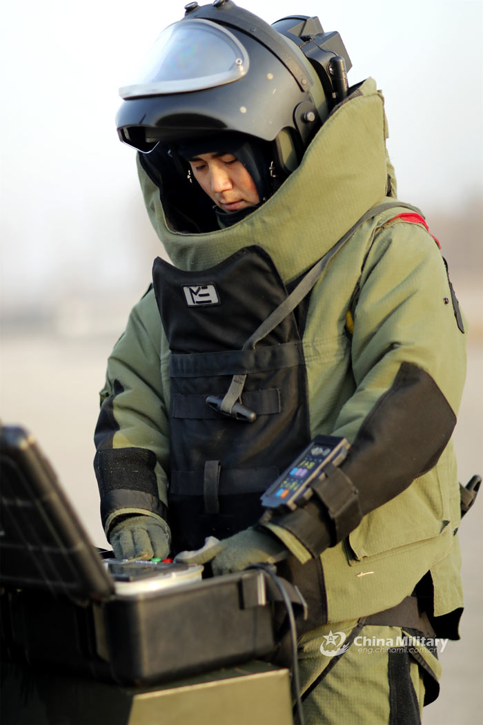 An operator assigned to a logistics training base of the PLA Air Force participates in an explosive ordnance disposal training exercise on January 19, 2023. (eng.chinamil.com.cn/Photo by Shen Weihong)