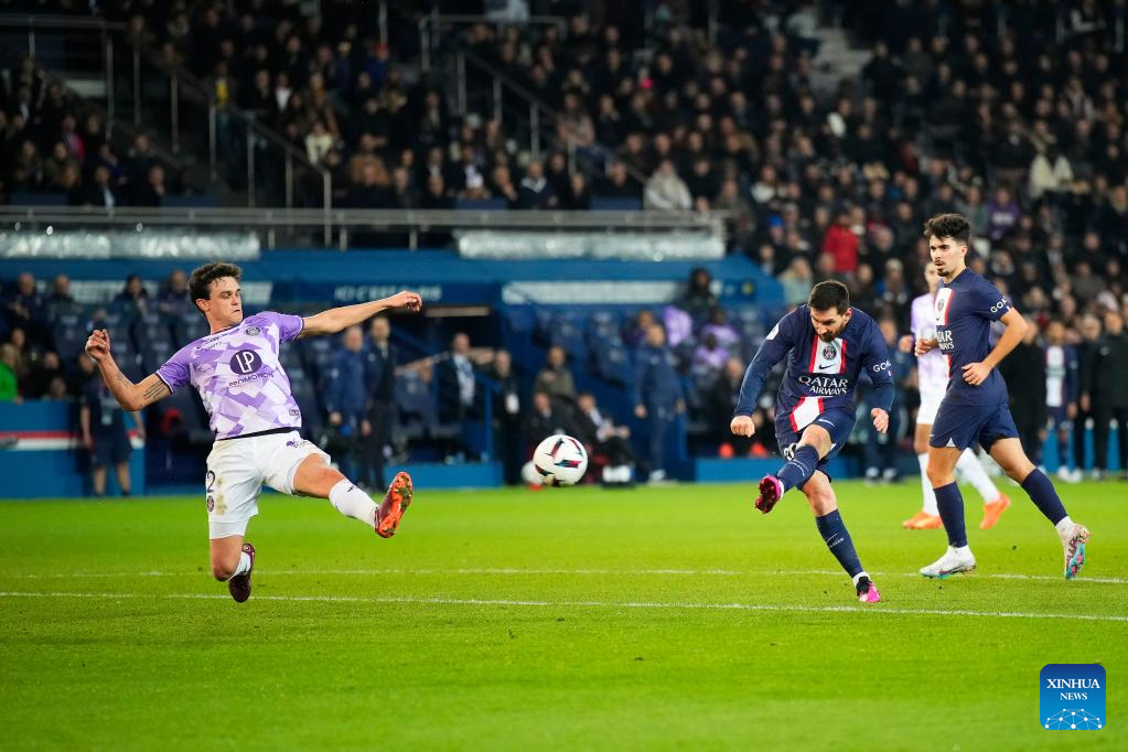 Paris Saint-Germain's Lionel Messi (C) shoots during a French Ligue 1 football match between Paris Saint-Germain (PSG) and Toulouse FC in Paris, France, Feb. 4, 2023. (Photo by Glenn Gervot/Xinhua)