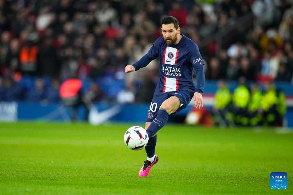 Paris Saint-Germain's Lionel Messi competes during a French Ligue 1 football match between Paris Saint-Germain (PSG) and Toulouse FC in Paris, France, Feb. 4, 2023. (Photo by Glenn Gervot/Xinhua)