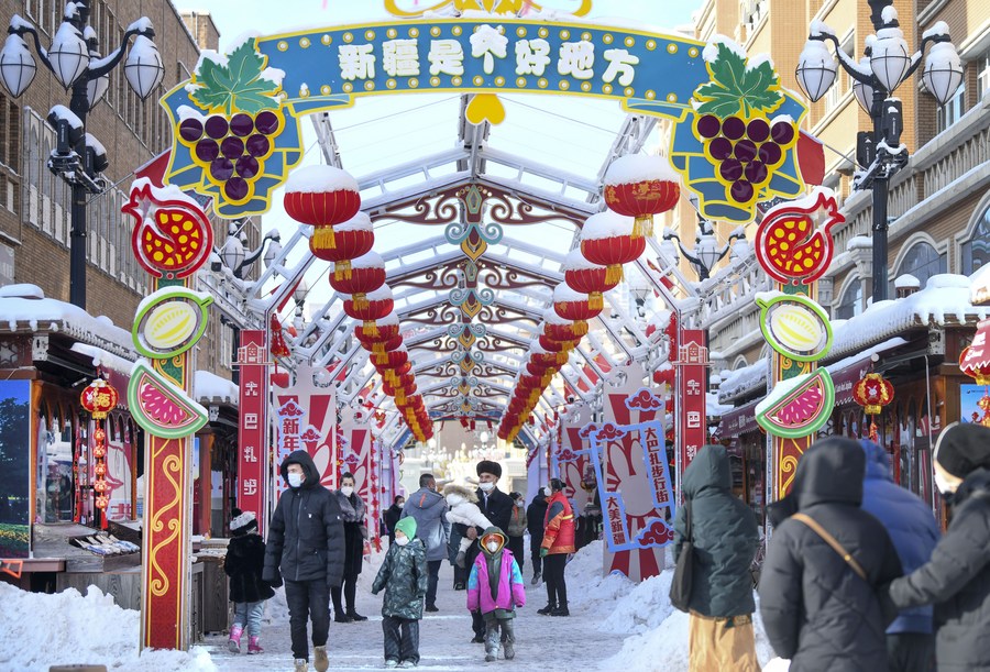 People tour the grand bazaar in Urumqi, northwest China's Xinjiang Uygur Autonomous Region, Jan. 23, 2023. (Xinhua/Wang Fei)