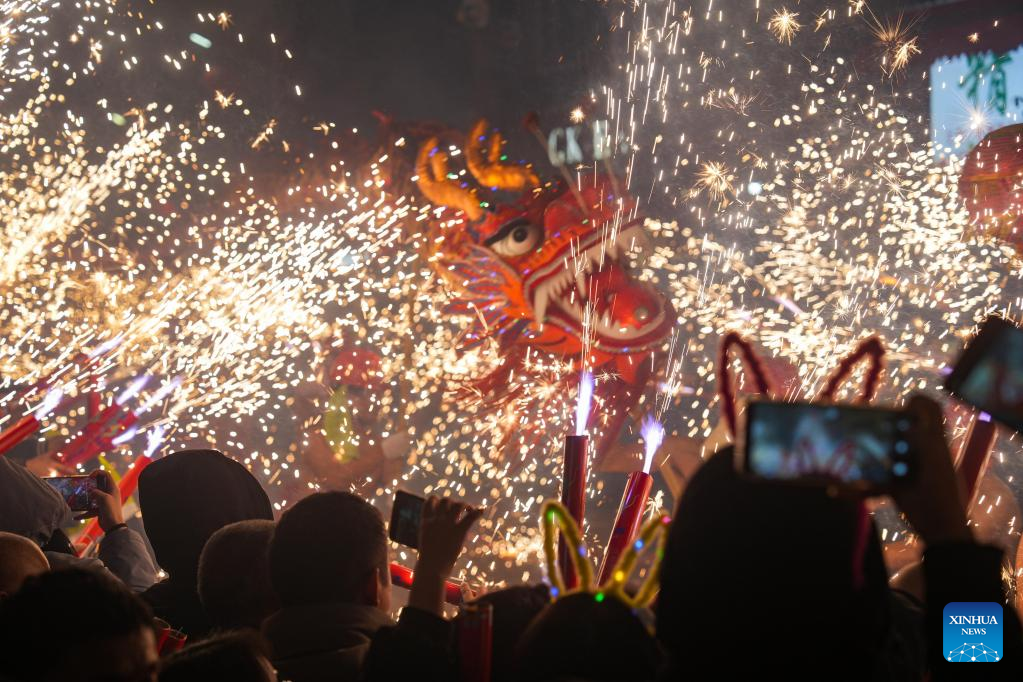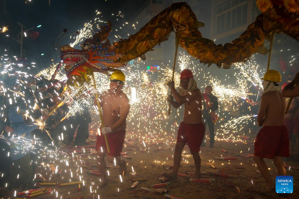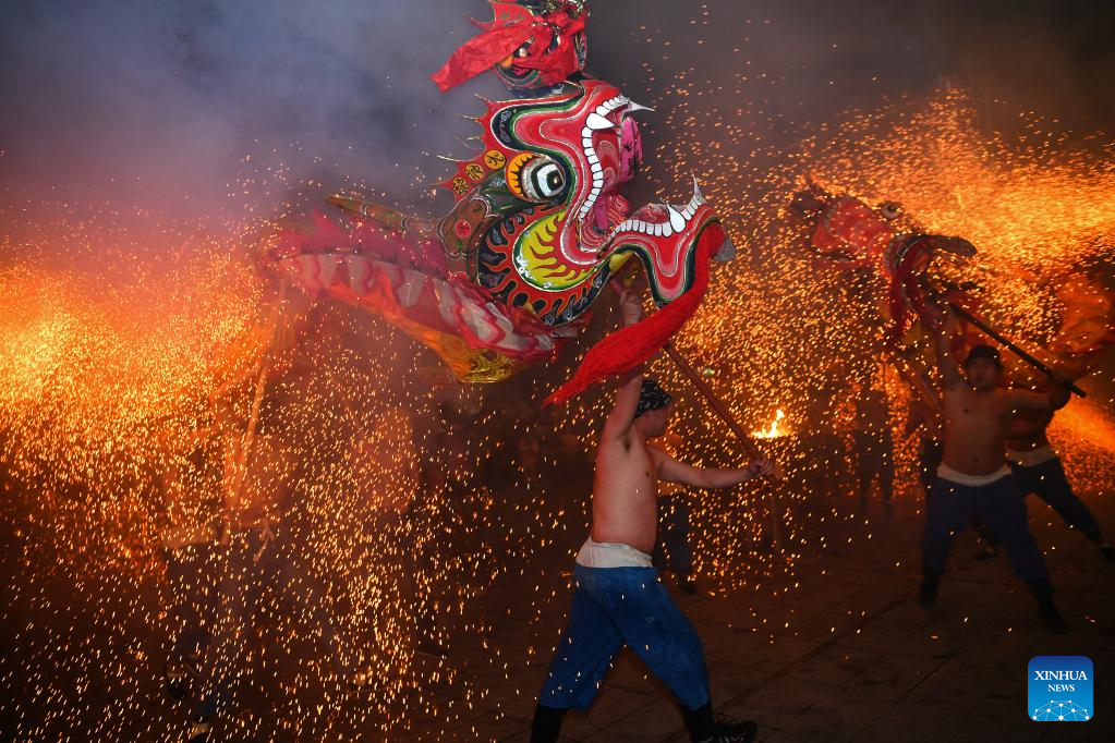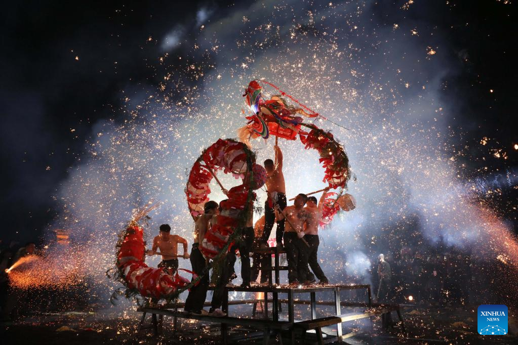Folk artists perform a fire dragon dance in Baojing County, central China's Hunan Province, Feb. 4, 2023. Various events are held across the country to celebrate the Lantern Festival, the 15th day of the first month of the Chinese lunar calendar, which falls on Feb. 5 this year. (Photo by Long Enze/Xinhua)
