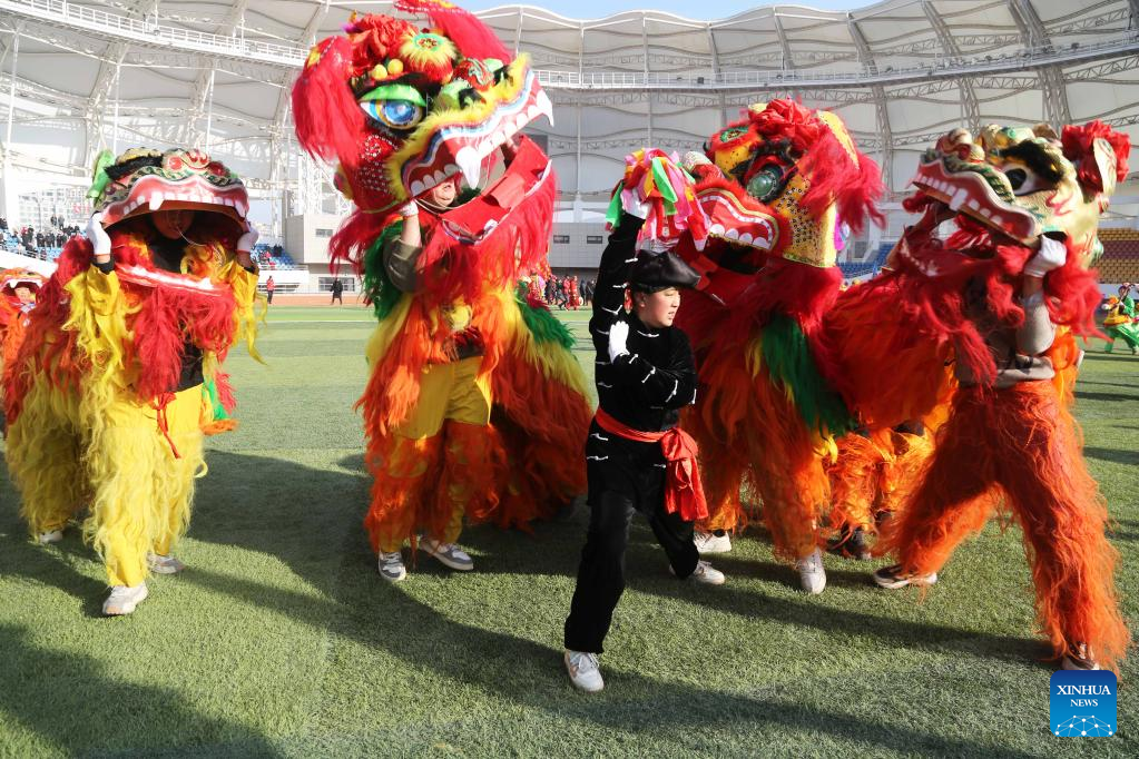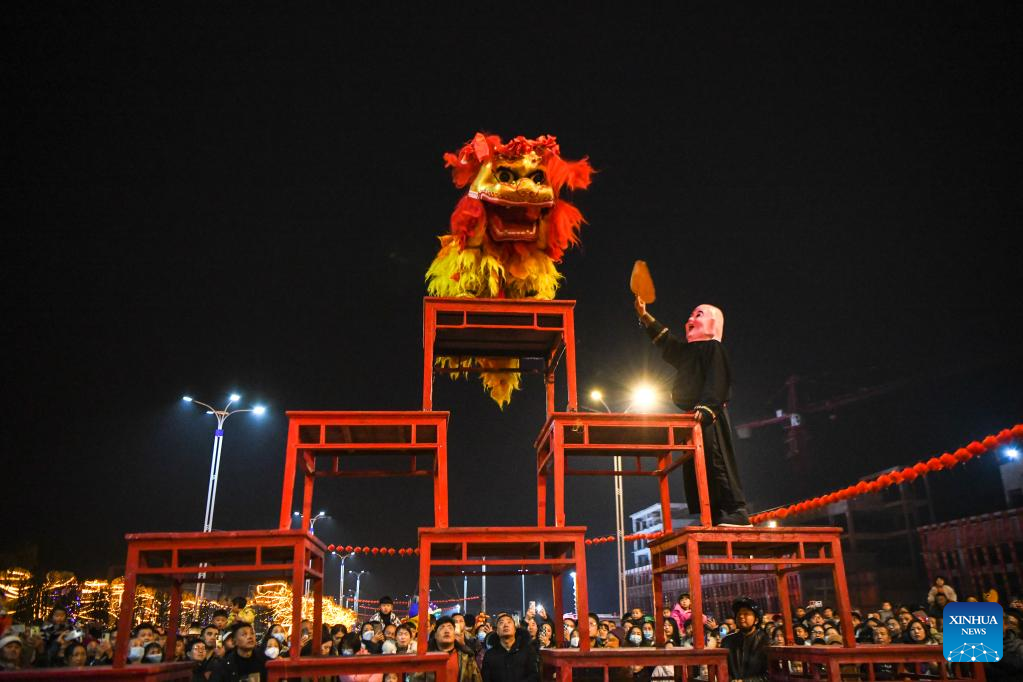 People perform lion dance in Dingxi, northwest China's Gansu Province, Feb. 4, 2023. Various events are held across the country to celebrate the Lantern Festival, the 15th day of the first month of the Chinese lunar calendar, which falls on Feb. 5 this year. (Photo by Wang Kexian/Xinhua)