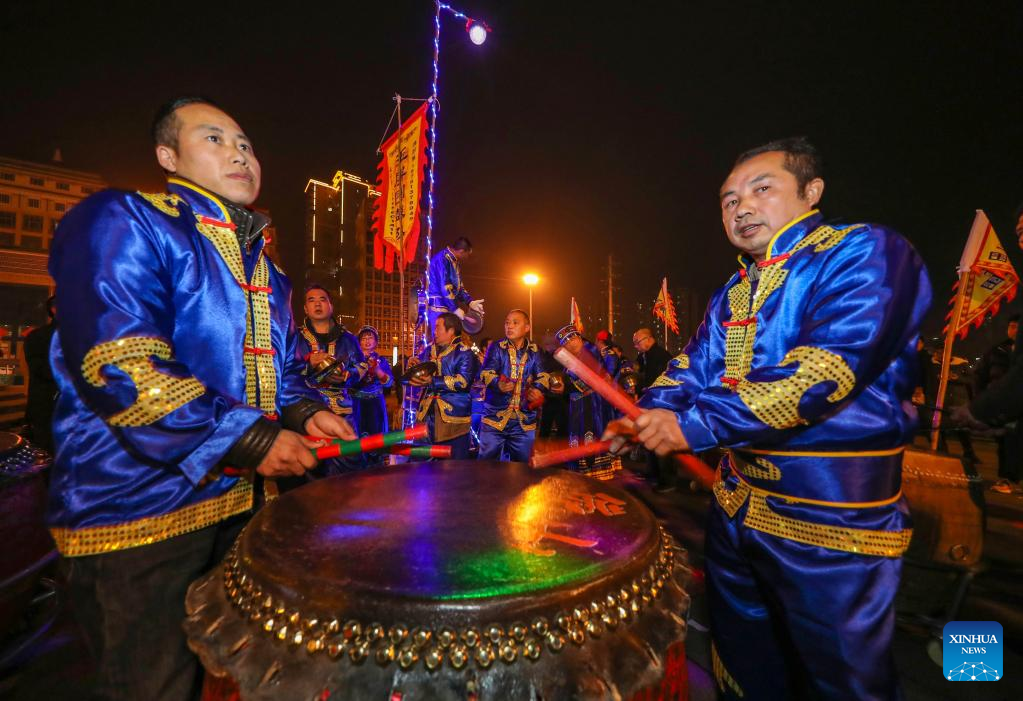 People beat drums and gongs in Yuping Dong Autonomous County of Tongren City, southwest China's Guizhou Province, Feb. 4, 2023. Various events are held across the country to celebrate the Lantern Festival, the 15th day of the first month of the Chinese lunar calendar, which falls on Feb. 5 this year. (Photo by Hu Panxue/Xinhua)