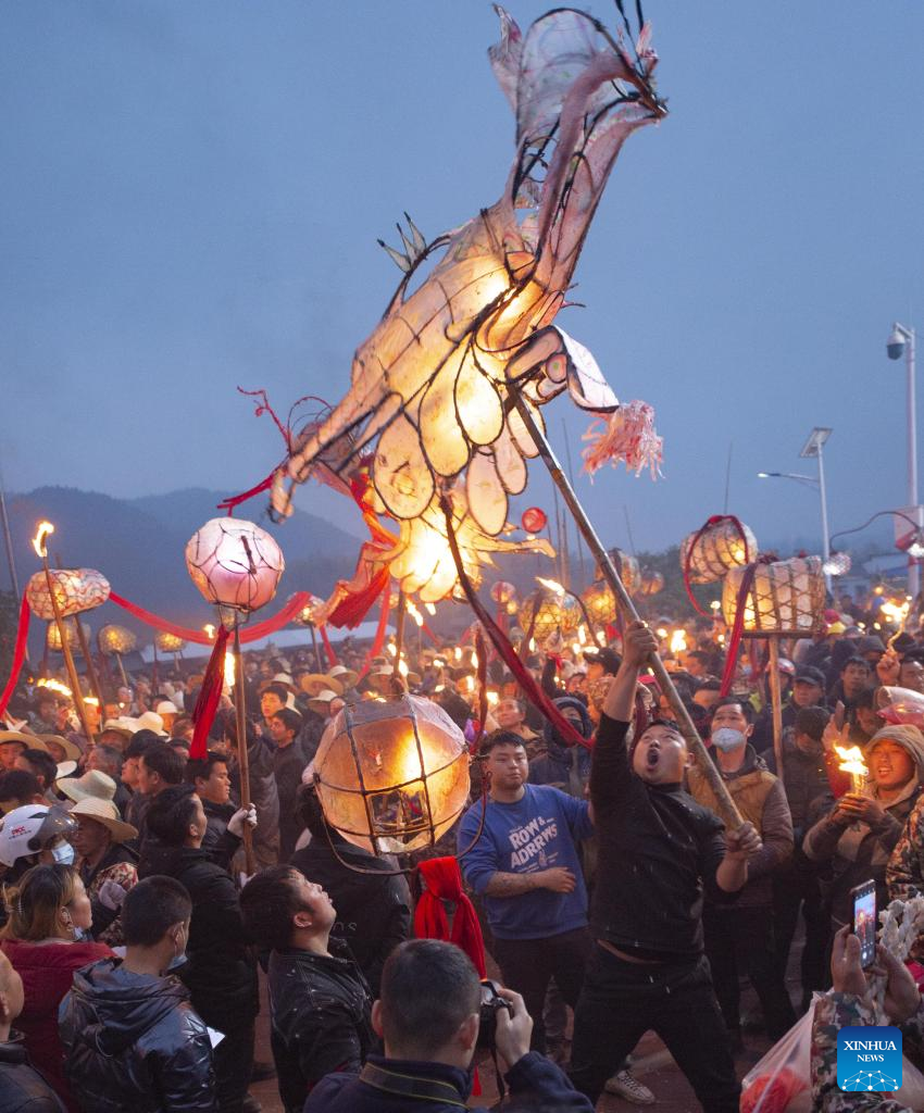 People perform dragon dance in Chengguan Town of Shibing County in Qiandongnan Miao and Dong Autonomous Prefecture, southwest China's Guizhou Province, Feb. 4, 2023. Various events are held across the country to celebrate the Lantern Festival, the 15th day of the first month of the Chinese lunar calendar, which falls on Feb. 5 this year. (Photo by Mo Guibin/Xinhua)