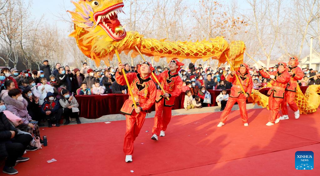 People perform dragon dance in Bincheng District of Binzhou, east China's Shandong Province, Feb. 4, 2023. Various events are held across the country to celebrate the Lantern Festival, the 15th day of the first month of the Chinese lunar calendar, which falls on Feb. 5 this year. (Photo by Li Rongxin/Xinhua)