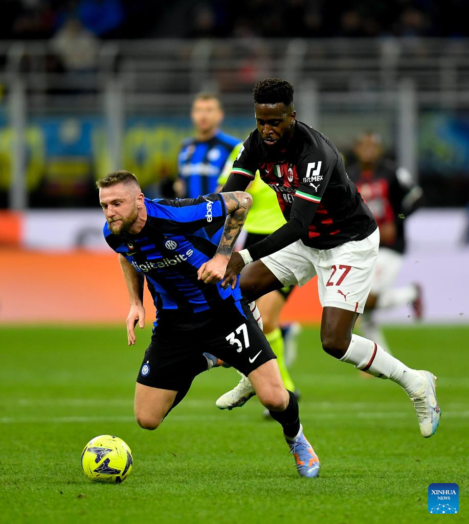 Inter Milan's Milan Skriniar (L) vies with AC Milan's Divock Origi during their Serie A football match in Milan, Italy, on Feb. 5, 2023. (Photo by Xinhua/Daniele Mascolo)