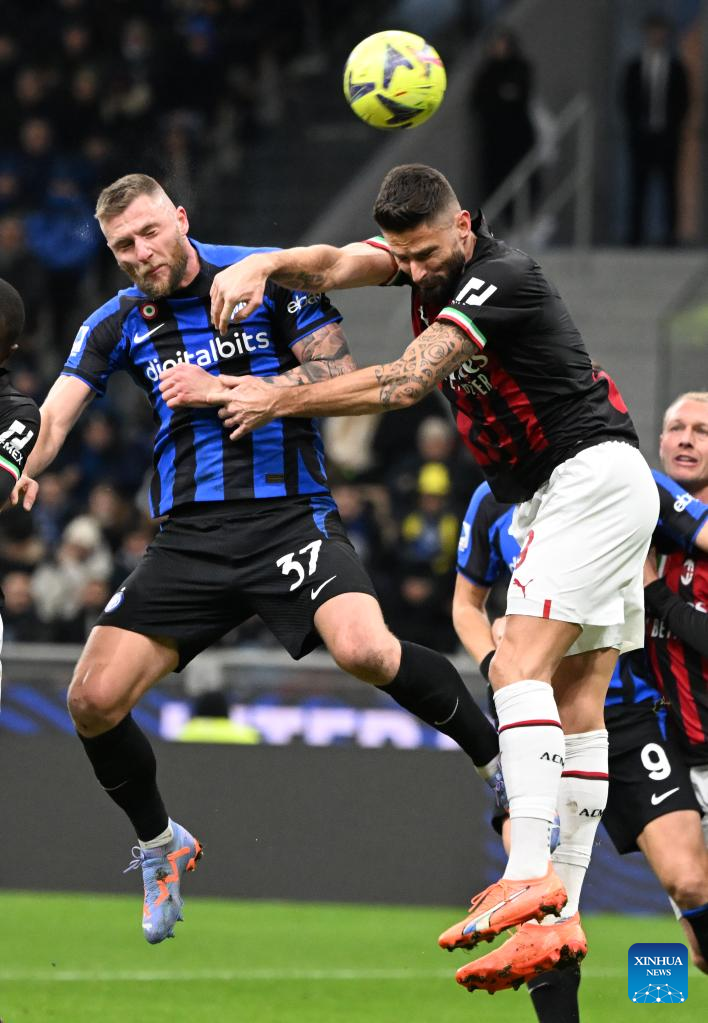 Inter Milan's Milan Skriniar (L) vies with AC Milan's Olivier Giroud during their Serie A football match in Milan, Italy, on Feb. 5, 2023. (Photo by Xinhua/Daniele Mascolo)
