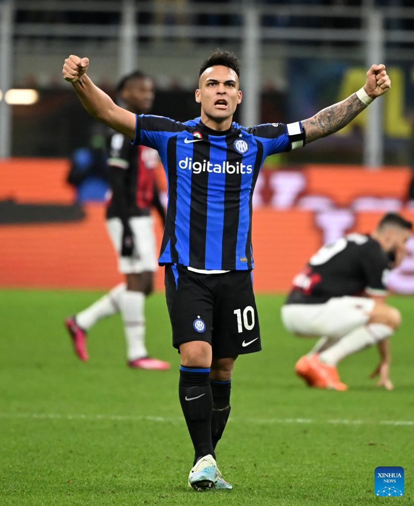 Inter Milan's Lautaro Martinez celebrates his goal during a Serie A football match between Inter Milan and AC Milan in Milan, Italy, on Feb. 5, 2023. (Photo by Xinhua/Daniele Mascolo)