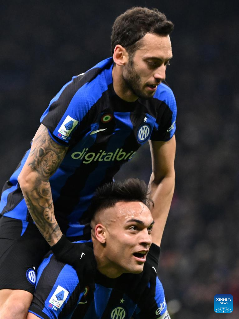Inter Milan's Lautaro Martinez (bottom) celebrates his goal with teammate Hakan Calhanoglu during a Serie A football match between Inter Milan and AC Milan in Milan, Italy, on Feb. 5, 2023. (Photo by Xinhua/Daniele Mascolo)