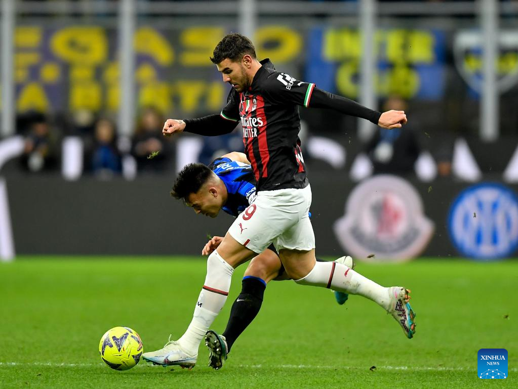 Inter Milan's Lautaro Martinez (back) vies with AC Milan's Theo Hernandez during their Serie A football match in Milan, Italy, on Feb. 5, 2023. (Photo by Xinhua/Daniele Mascolo)