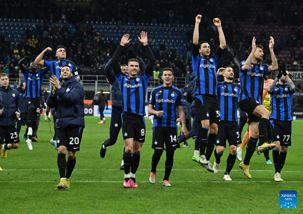 Players of Inter Milan celebrate after a Serie A football match between Inter Milan and AC Milan in Milan, Italy, on Feb. 5, 2023. (Photo by Xinhua/Daniele Mascolo)