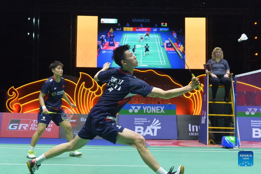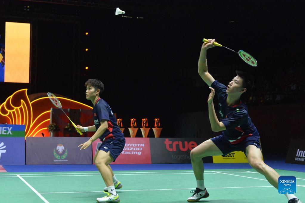 Feng Yanzhe/Huang Dongping (L) of China compete during the mixed doubles final match between Feng Yanzhe/Huang Dongping of China and Seo Seung Jae/Chae Yu Jung of South Korea at the Thailand Masters 2023 in Bangkok, Thailand, Feb. 5, 2023. (Xinhua/Rachen Sageamsak)