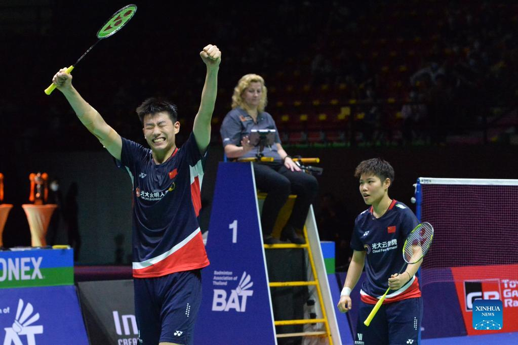 Feng Yanzhe/Huang Dongping (R) of China celebrate after the mixed doubles final match between Feng Yanzhe/Huang Dongping of China and Seo Seung Jae/Chae Yu Jung of South Korea at the Thailand Masters 2023 in Bangkok, Thailand, Feb. 5, 2023. (Xinhua/Rachen Sageamsak)
