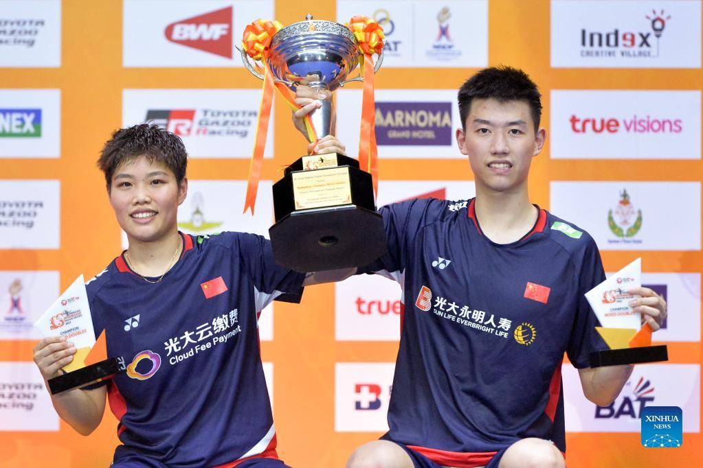 Feng Yanzhe/Huang Dongping (L) of China pose with their trophy after the awarding ceremony of the mixed doubles final match between Feng Yanzhe/Huang Dongping of China and Seo Seung Jae/Chae Yu Jung of South Korea at the Thailand Masters 2023 in Bangkok, Thailand, Feb. 5, 2023. (Xinhua/Rachen Sageamsak)