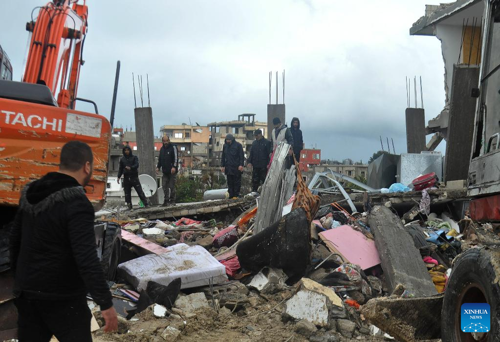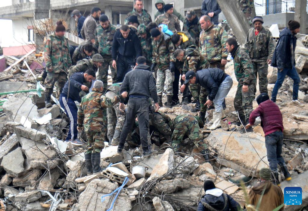 People search for survivors among the rubble of a building destroyed in a powerful earthquake in the city of Jableh, Latakia province, Syria, on Feb. 6, 2023. According to the Syrian health ministry and the Britain-based pro-rebel Syrian Observatory for Human Rights, a 7.7-magnitude earthquake jolted the northern Syrian provinces of Latakia, Tartous, Hama, Aleppo and Idlib on Monday, killing at least 870 and injuring 1,326. (Str/Xinhua)