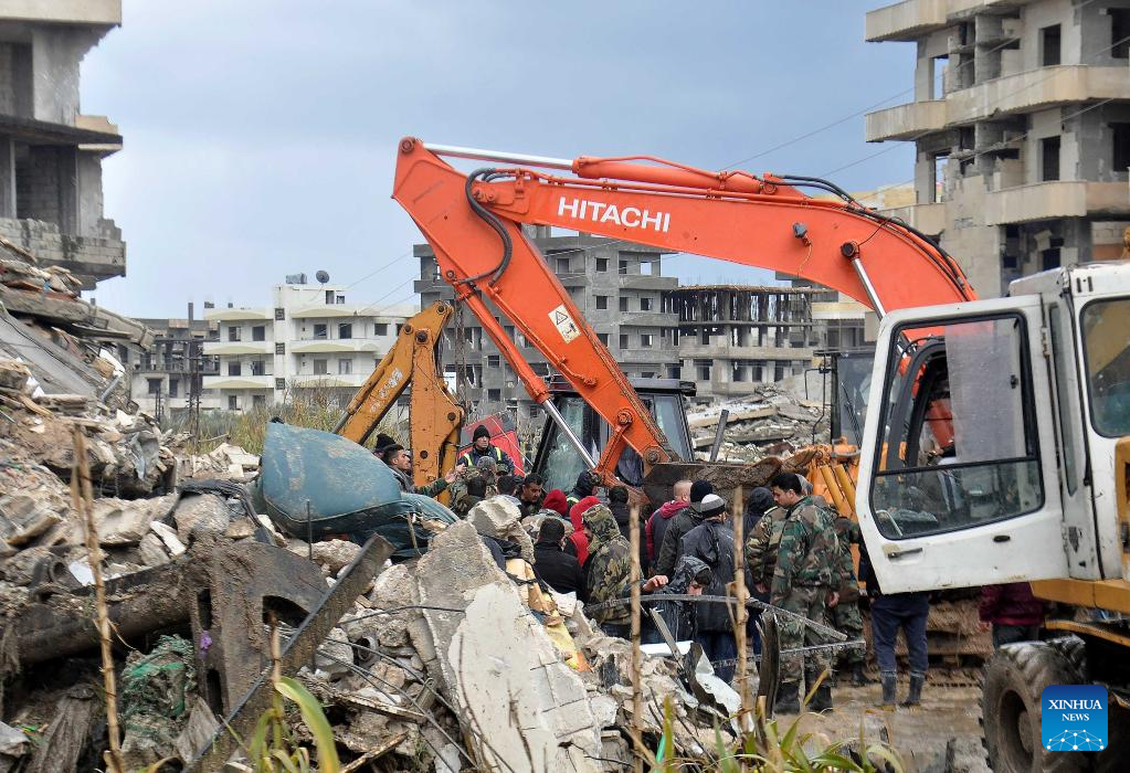 Rescuers work near the rubble of a building destroyed in a powerful earthquake in the city of Jableh, Latakia province, Syria, on Feb. 6, 2023. According to the Syrian health ministry and the Britain-based pro-rebel Syrian Observatory for Human Rights, a 7.7-magnitude earthquake jolted the northern Syrian provinces of Latakia, Tartous, Hama, Aleppo and Idlib on Monday, killing at least 870 and injuring 1,326. (Str/Xinhua)