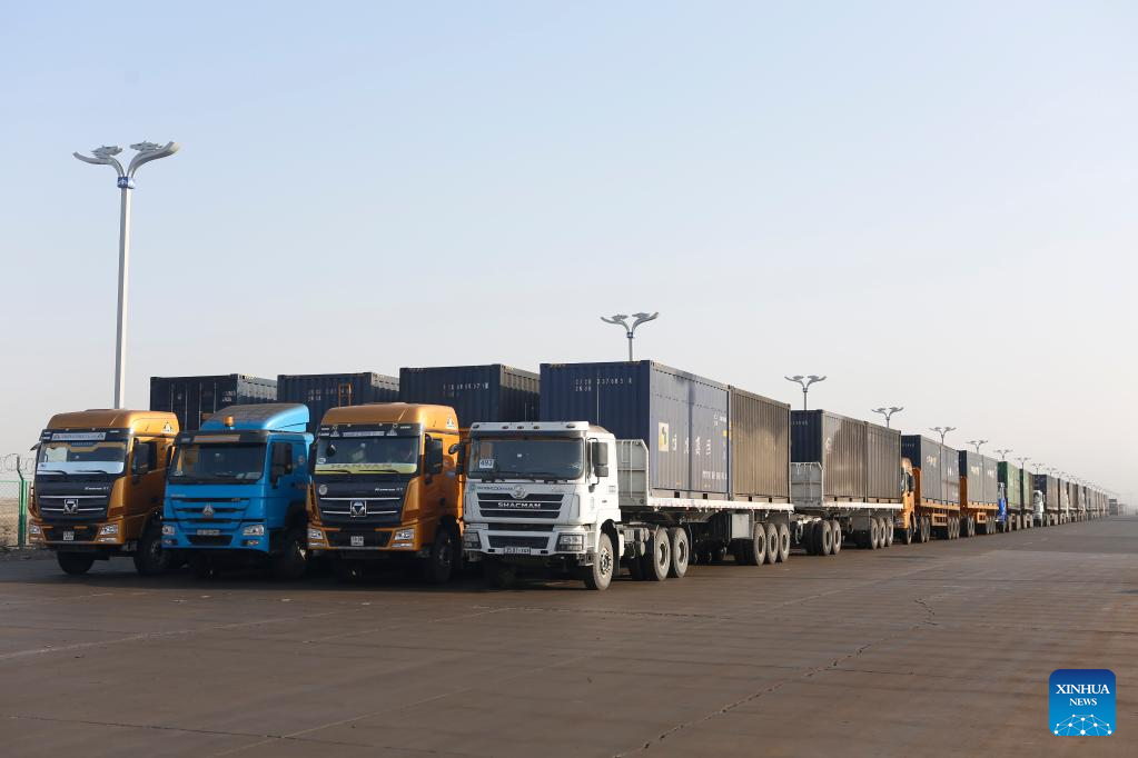 This photo taken on Jan. 25, 2023 shows cargo trucks at Ganqmod Port in the city of Bayannur, north China's Inner Mongolia Autonomous Region. (Xinhua/Li Yunping)