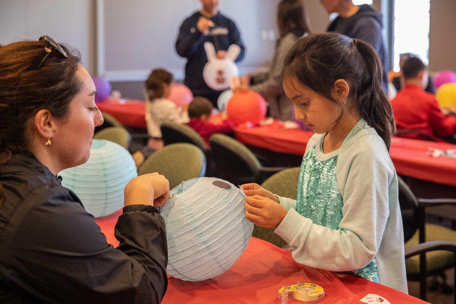 People learn to make lanterns during an event celebrating the Lantern Festival in Southlake, Texas, the United States, Feb. 4, 2023. (Photo by Xin Jin/Xinhua)
