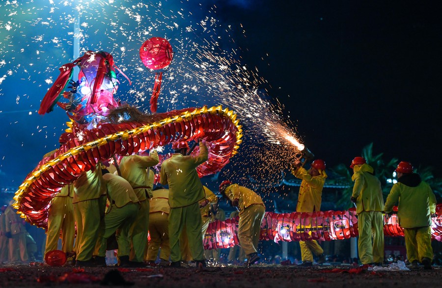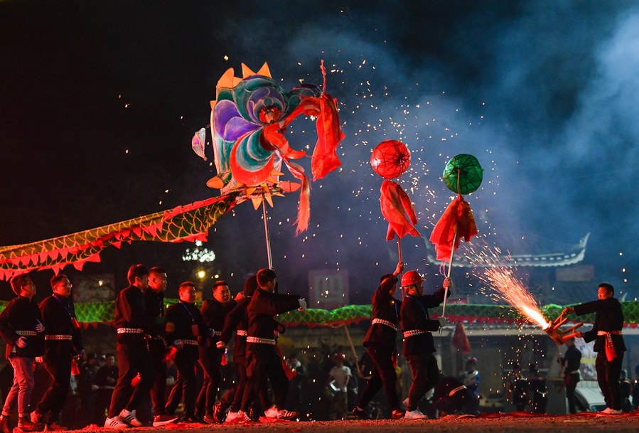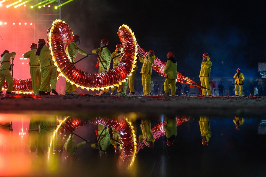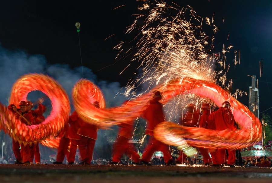 TAIJIANG, Feb. 6 (Xinhua) -- The traditional "Wulong Xuhua" show is a kind of dragon dance performed amid fireworks by the Miao ethnic group. It was listed as a national intangible cultural heritage in 2021.
