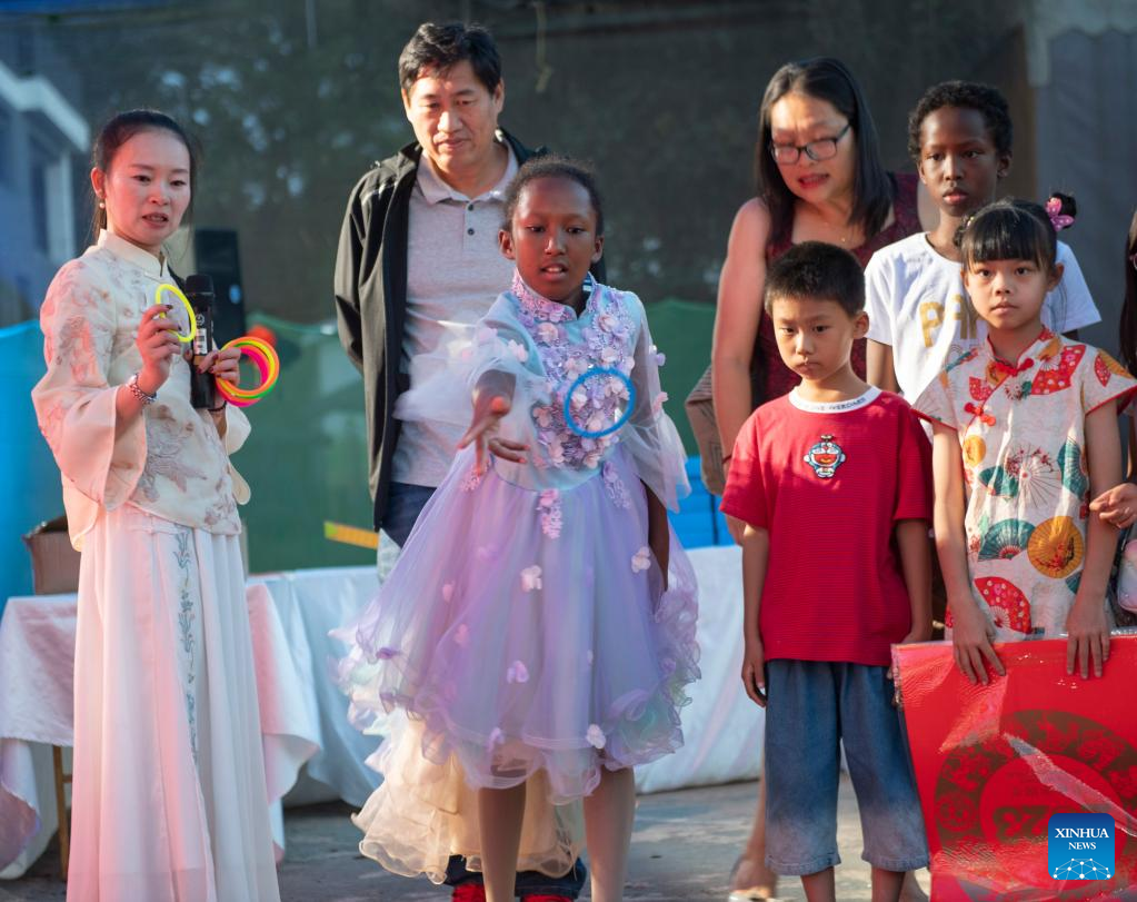 Residents try traditional Chinese costumes during an event in celebration of the Lantern Festival in Nairobi, Kenya, Feb. 5, 2023. An event featuring various activities was held in Kenya's capital Nairobi in celebration of the Lantern Festival on Sunday. (Xinhua/Li Yahui)