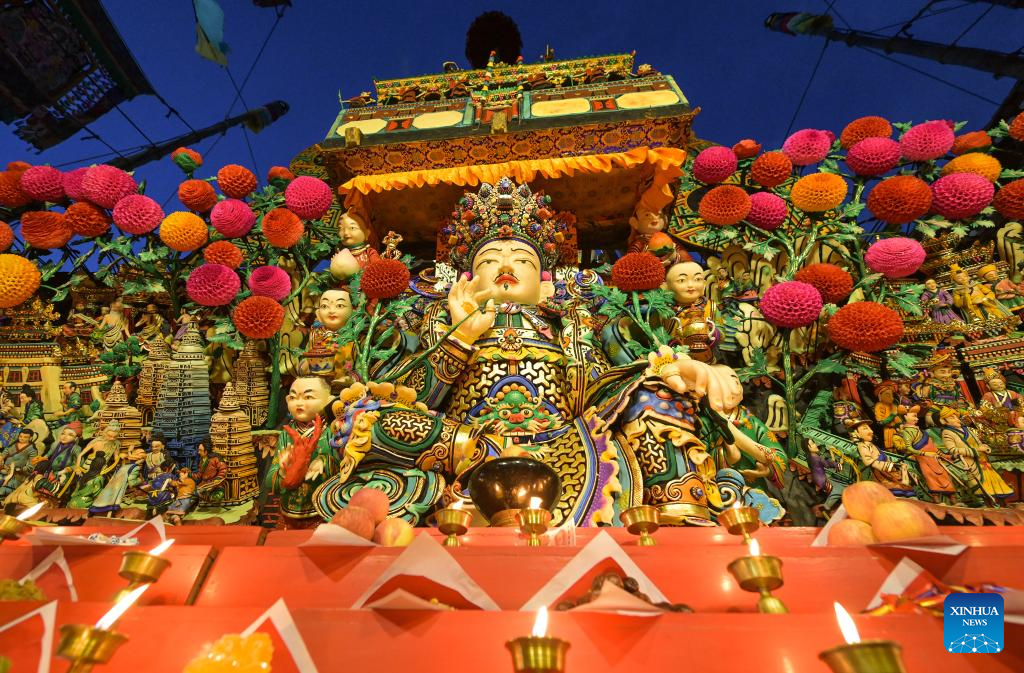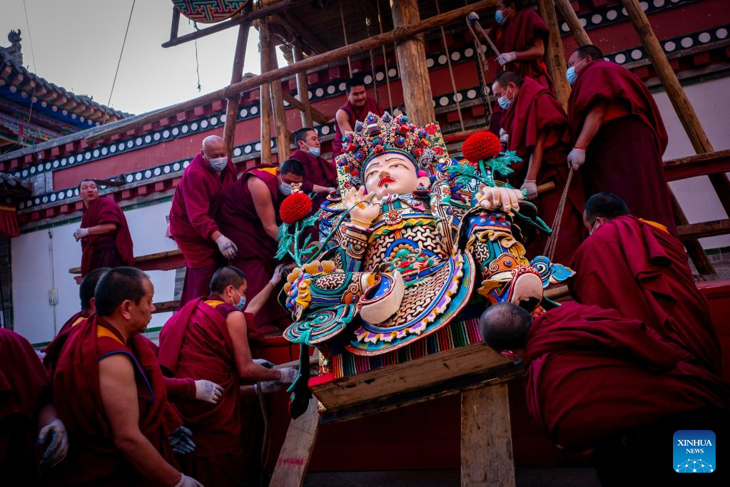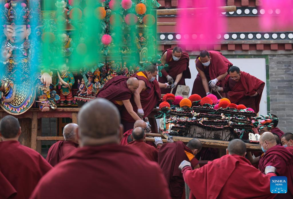 Lamas prepare an exhibition of butter sculptures at the Taer Monastery in Huangzhong District of Xining, northwest China's Qinghai Province, Feb. 5, 2023. The butter sculptures are handmade by lamas in shapes of Buddha figurines, trees, flowers, birds and animals. (Xinhua/Li He)