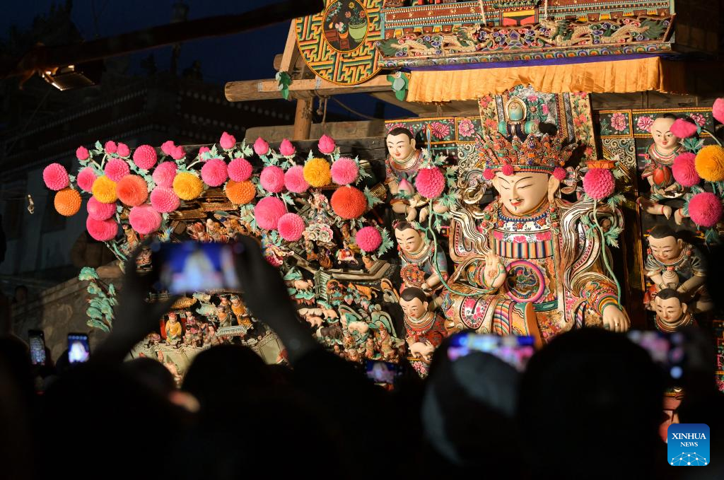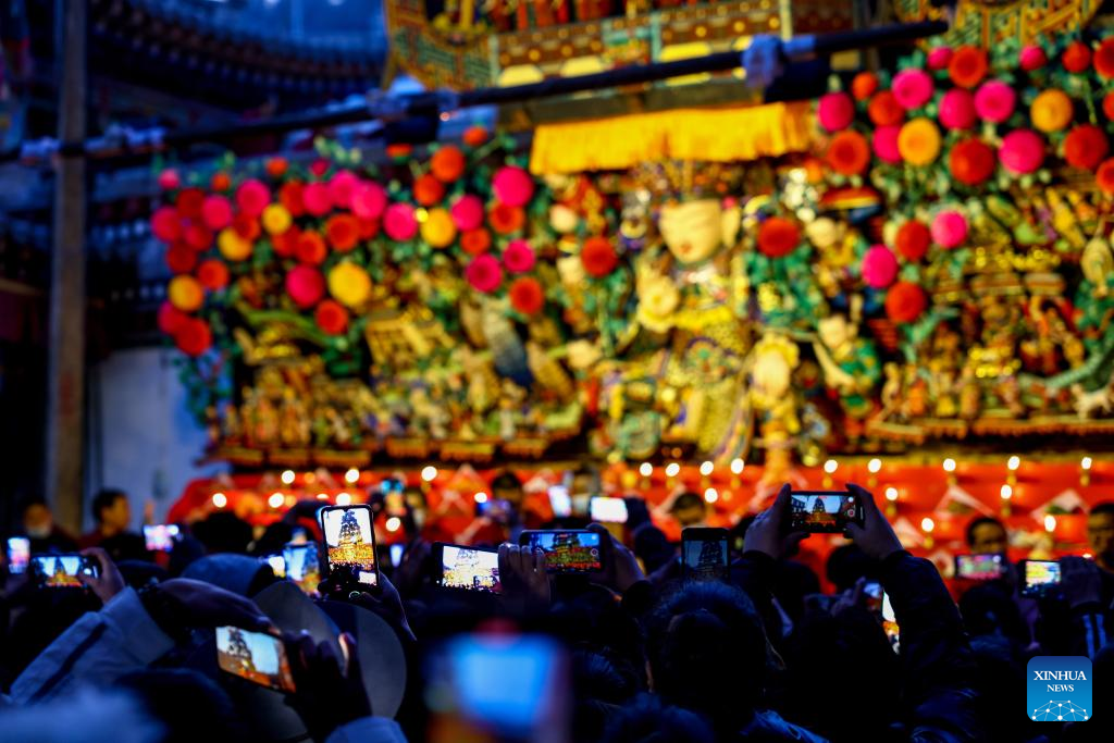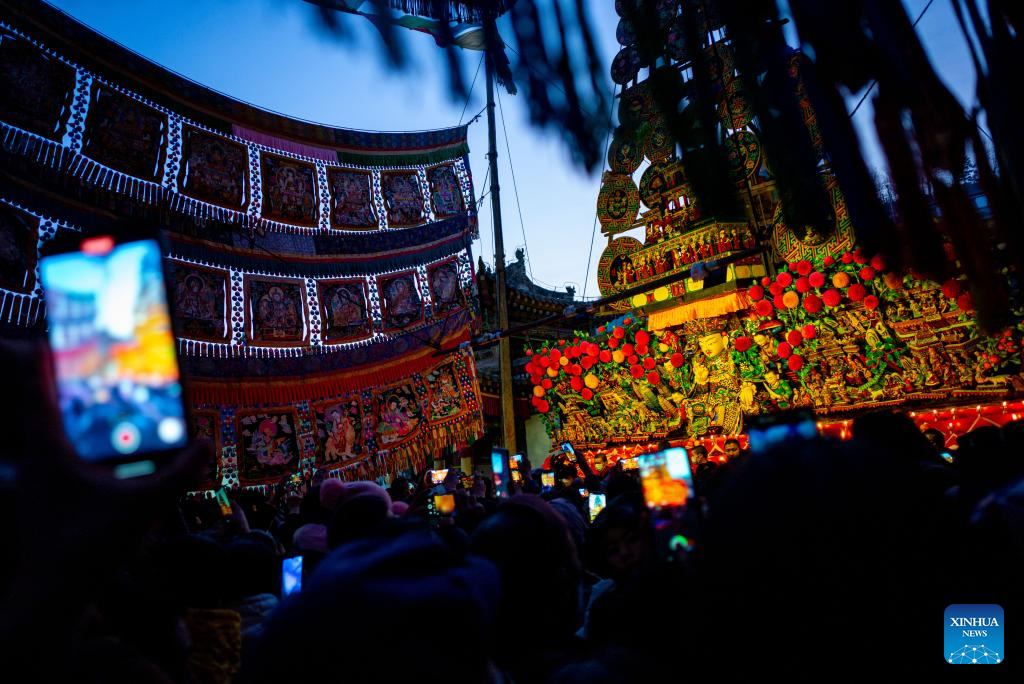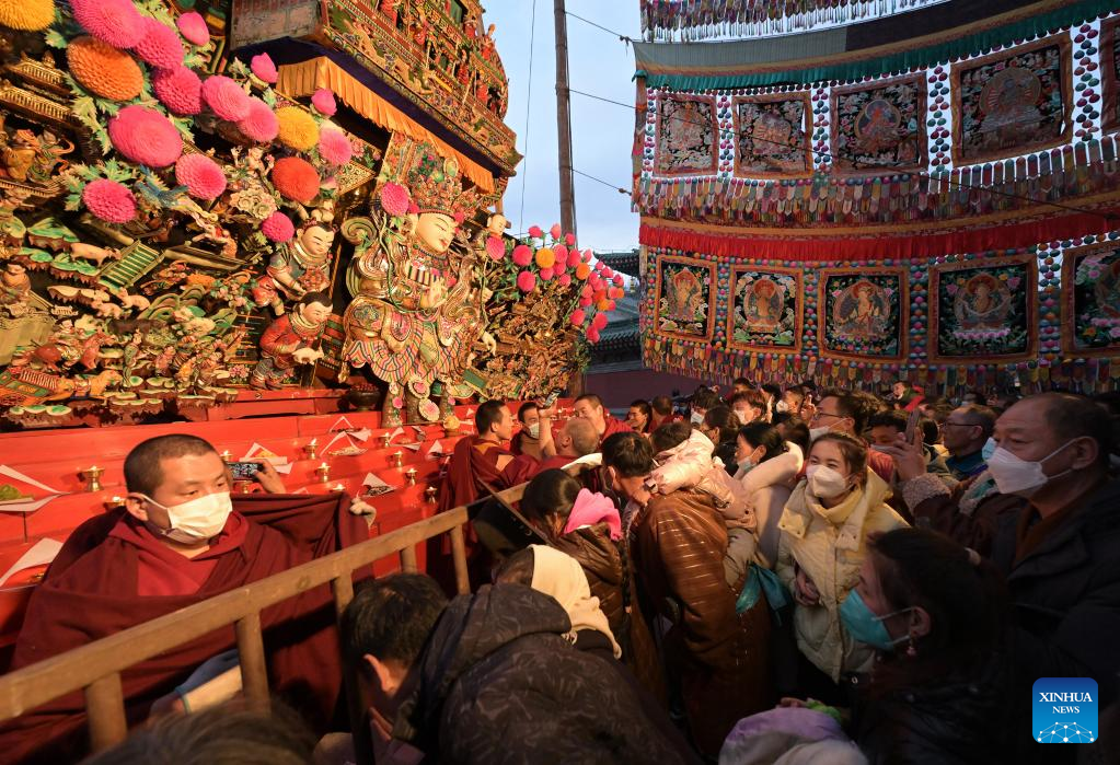 People take pictures of butter sculptures at the Taer Monastery in Huangzhong District of Xining, northwest China's Qinghai Province, Feb. 5, 2023. The butter sculptures are handmade by lamas in shapes of Buddha figurines, trees, flowers, birds and animals. (Xinhua/Liu Jinhai)