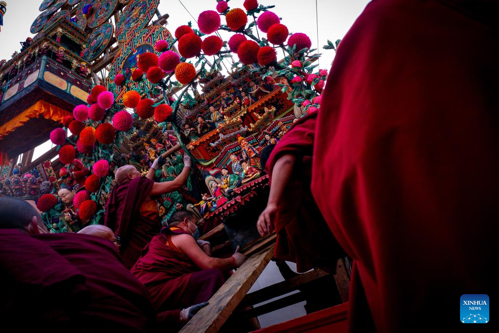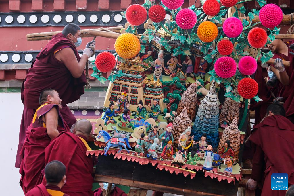 Lamas prepare an exhibition of butter sculptures at the Taer Monastery in Huangzhong District of Xining, northwest China's Qinghai Province, Feb. 5, 2023. The butter sculptures are handmade by lamas in shapes of Buddha figurines, trees, flowers, birds and animals. (Xinhua/Liu Jinhai)