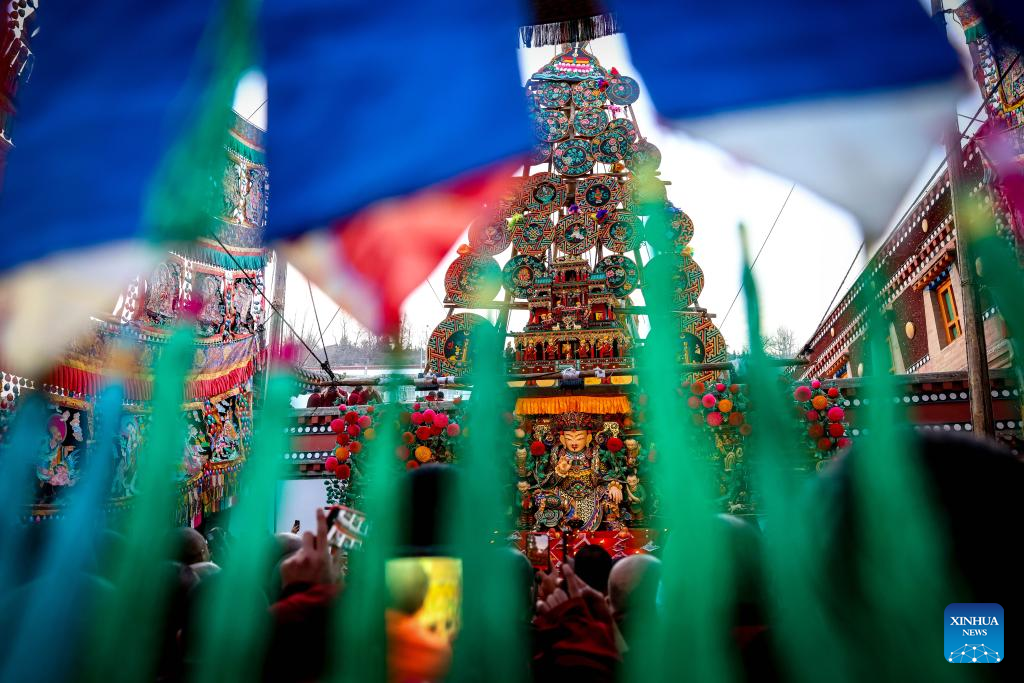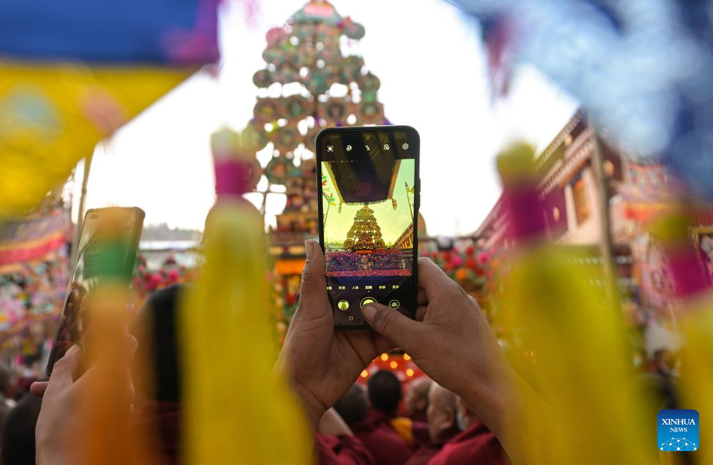 People take pictures of butter sculptures at the Taer Monastery in Huangzhong District of Xining, northwest China's Qinghai Province, Feb. 5, 2023. The butter sculptures are handmade by lamas in shapes of Buddha figurines, trees, flowers, birds and animals. (Xinhua/Li He)