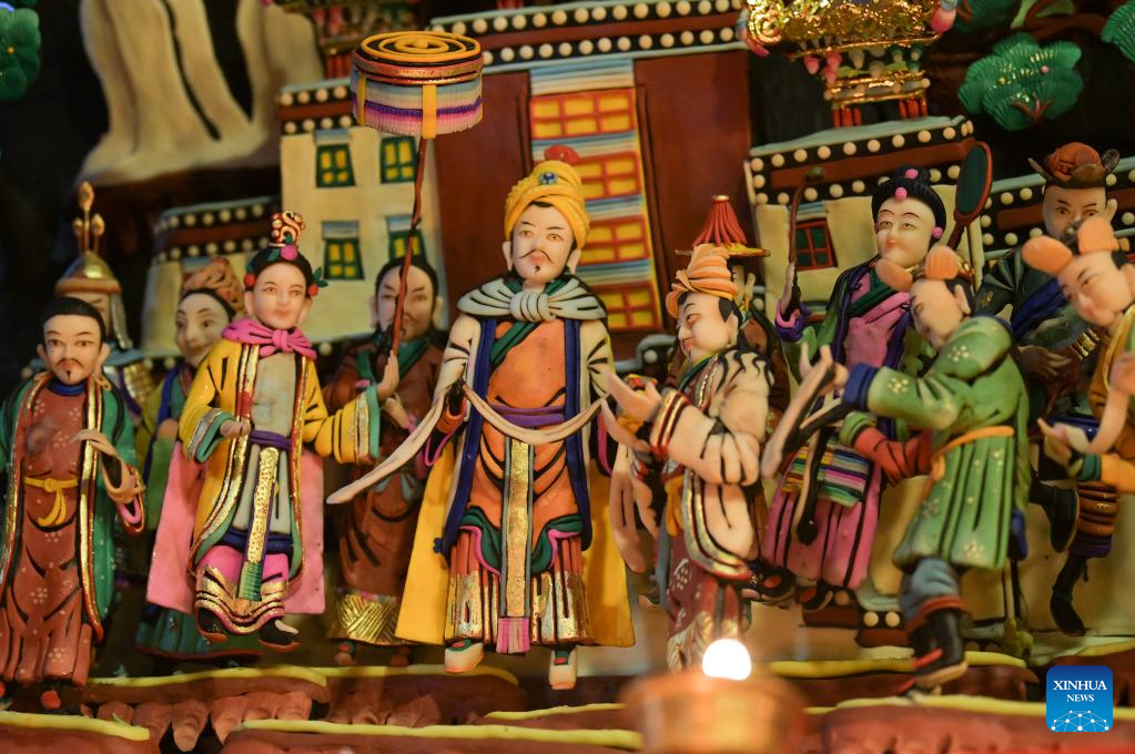 Butter sculptures are pictured at an exhibition at the Taer Monastery in Huangzhong District of Xining, northwest China's Qinghai Province, Feb. 5, 2023. The butter sculptures are handmade by lamas in shapes of Buddha figurines, trees, flowers, birds and animals. (Xinhua/Li He)