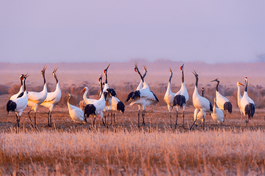 A flock of red-crowned cranes gather at a rare bird national nature reserve in Yancheng, east China’s Jiangsu Province. (Photo/Qi Xiaoyun)