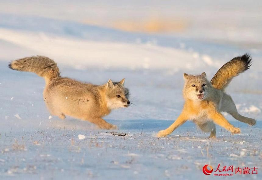 Corsac foxes play in a snowfield, in north China’s Inner Mongolia Autonomous Region. (People’s Daily Online/Xiao Gang)