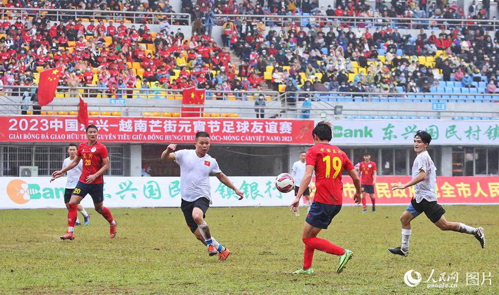 A friendly football match is held to celebrate the Lantern Festival between a Chinese team and a team from Vietnam in Dongxing, south China’s Guangxi Zhuang Autonomous Region, on Feb. 5, 2023. (People’s Daily Online/Yan Lizheng)