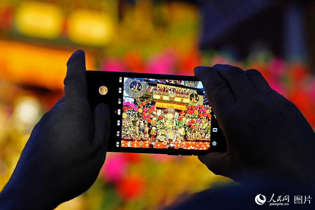 A visitor takes photos of the butter flowers in Ta’er Monastery in Xining, northwest China’s Qinghai Province, on Feb. 5, 2023. (People’s Daily Online/Gan Haiqiong)