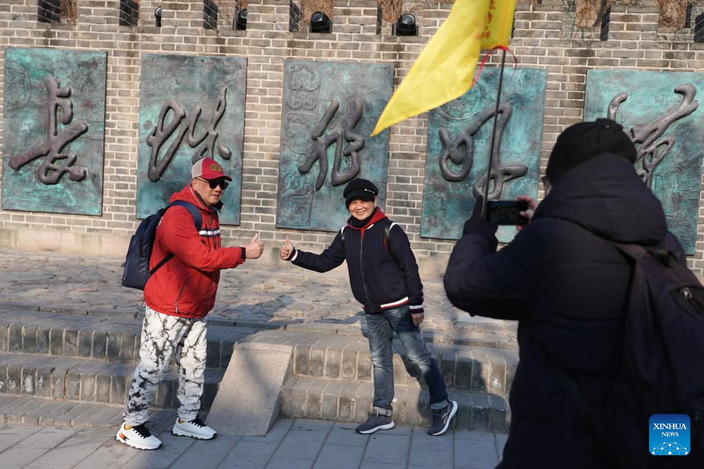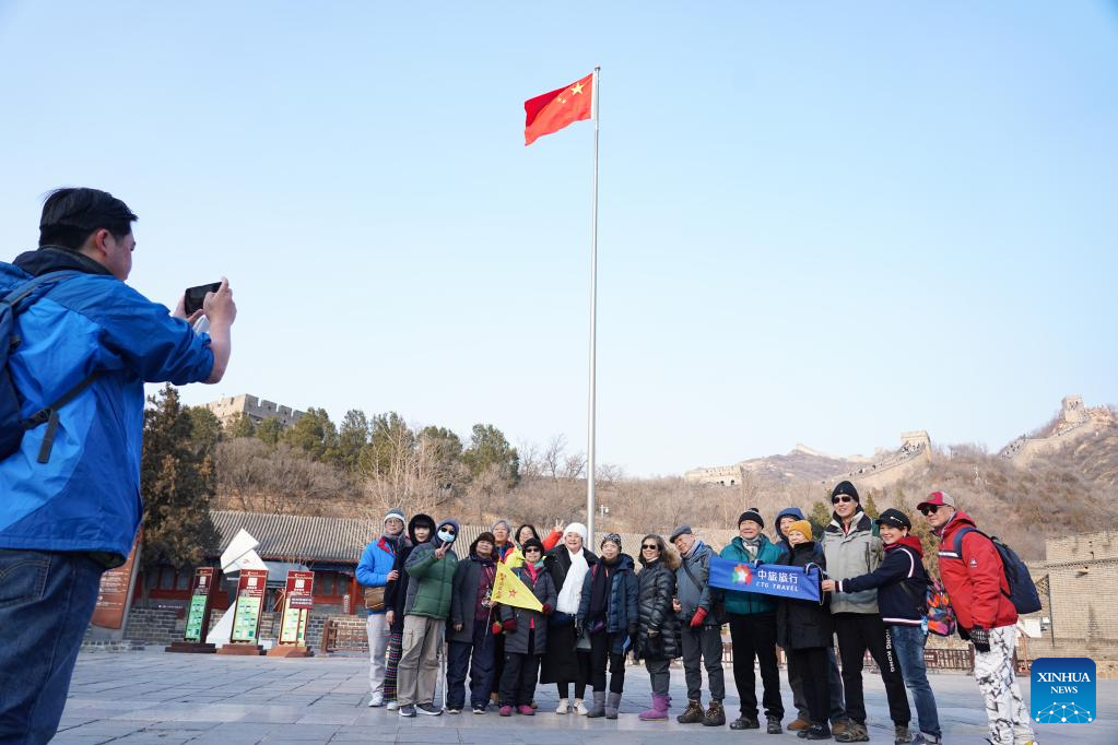 Elderly tourists from Hong Kong pose for photos at Badaling section of the Great Wall in Beijing, capital of China, Feb. 7, 2023. (Xinhua/Chen Zhonghao)